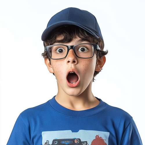young teen boy, foreign exhange student, nerd glasses, pimples, braces, smiling, dark hair, blue t shirt with gaming graphics, ball cap, solid white background