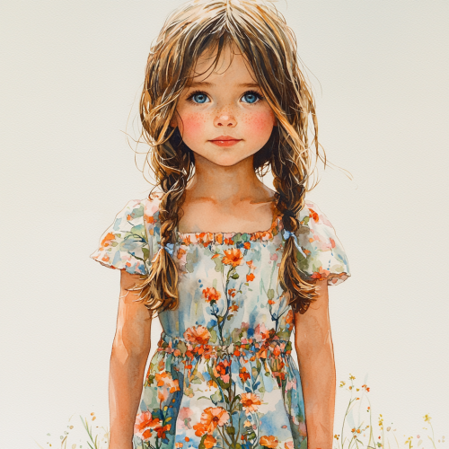 this exact style of watercolor illustration, a young girl with brown hair and blue eyes, age 7, wearing a flower dress and sandals --q 2 --s 750 --v 6.1