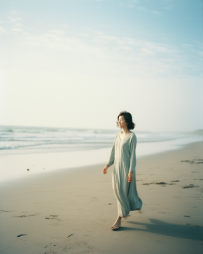 Dreamy film portrait of a woman, walking on the beach, morning, side angle, Lomography, expired film, old film photo gain, old film color scheme, 35㎜ film Leica, --ar 4:5 --style raw-e5I1EhTeYI0TDhWa