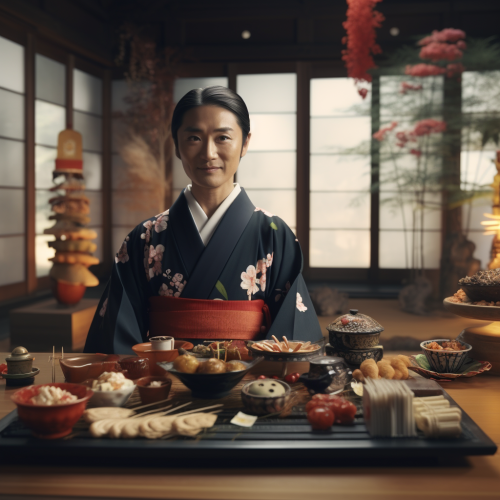 realistic photo of Japanese celebrant the Kuadore ceremony with traditional dishes in the background in 4K, front shot modeling
