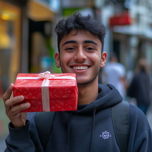 a real-life photo of an arab looking young man,wearing casual wear, black hair, around 20 years old, looking happy, raising a gift he got high, make the gift unknown, like a gift box, zoom out