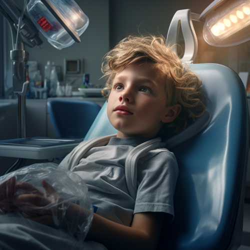 child in dentist chair in a bright and modern dental office in hyper realism style photography --v 5.2