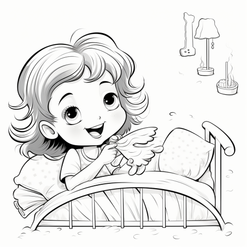 a little girl brushing her teeth with a tooth brush in a cot for sleeping as coloring page for kids