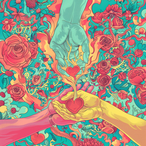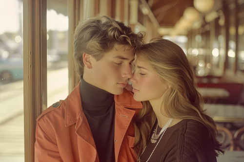 realistic high quality photo of A romantic and intimate scene in a music venue with a young couple standing close, facing each other, both in profile. The man is white, he is wearing a black turtleneck, a red trenchcoat, and silver chains, has short dark curly hair, while the woman has long, blond hair flowing loosely, and she is wearing a black shirt. Their faces are softly lit, with gentle expressions as they share a deep, emotional connection. The background is blurred and dreamy, with soft pastel tones creating an ethereal atmosphere. The overall mood is calm, serene, and tender, with a mix of warm and cool lighting. minimalistic, a bit blurred, soft colors, dreamy mood, emotional feeling, ethereal --sref 3840558885 --style raw --ar 3:2 --v 6.0 --s 250