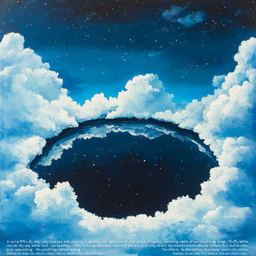 "A surreal 1970s-style oil painting, reminiscent of David Hockney's work, featuring a large, dark pool in the sky surrounded by soft, fluffy white clouds against a vibrant blue backdrop. The pool, calm and mirror-like, reflects tiny stars in a way that evokes an infinite, night-sky-like depth. The clouds swirl gently around the pool's edge, adding a dreamlike and whimsical quality. The colors are bold, with bright blues, soft whites, and deep blacks, creating a stark contrast typical of Hockney's clean, minimalist aesthetic from the era."