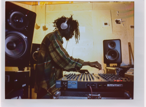 flash polaroiod instant film unexpected angle photograph of hip young man with dreads in studio producing music, one hand on headphones, intently listening --ar 15:11 --v 6.0