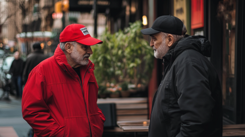 a man in all black asking an old new york man in all red, close up shot chest up of the men, behind is a simple restaurant with minimalstic vibes and some green in New York, during the middle of the day --ar 16:9