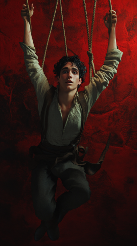 2 sides of the screen black and red background. In the center of the picture is a young man hanging in the air, his body pulled from both sides by invisible ropes He have black hair, eyes dark blue. He wore simple clothes in stile France in the early 19th century. super detail, ambient occlusion, volumetric lighting, high contrast, HDR, 8K --ar 9:16