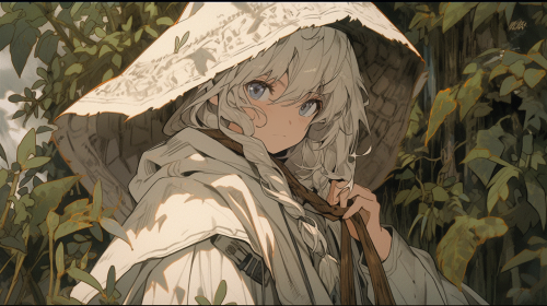 Vintage 80s-90s anime young Wiccan, shojo manga style, tattered white robes, luminous eyes, eerie forest, floral hair ornament, ragged witch hat, gnarled wooden staff with cloth and vine wrappings, cel shading, VHS aesthetic --ar 16:9 --stylize 1000 --niji 5