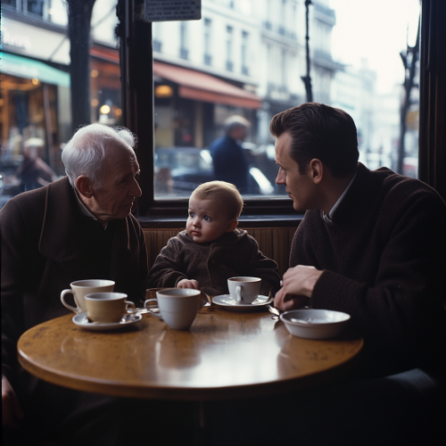a color photograph of the philosopher Martin Heidegger sitting at a table in a 1950s Parisian café and staring thoughtfully into the distance --ar 4:5