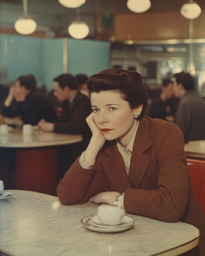 a color photograph of the philosopher Simone de Beauvoir sitting at a table in a 1950s Parisian café and staring thoughtfully into the distance --ar 4:5