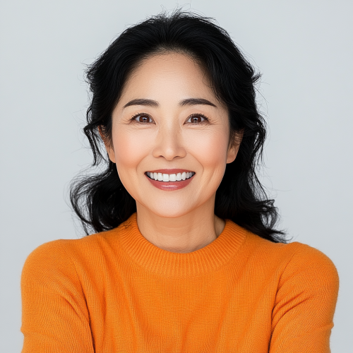 a young, trendy-looking Korean woman in her 50s with confident smile and a mouth of white teeth, black hair, on complete white background, with bright smile, no crop of her hands and arms, showing whole body, standing, bright big eye, with bright color clothes