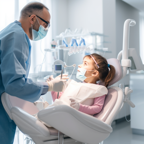 child in dentist chair conducting dental work in a bright and modern dental office with the dentist wearing mask and protective goggles in hyper realism style photography --v 5.2