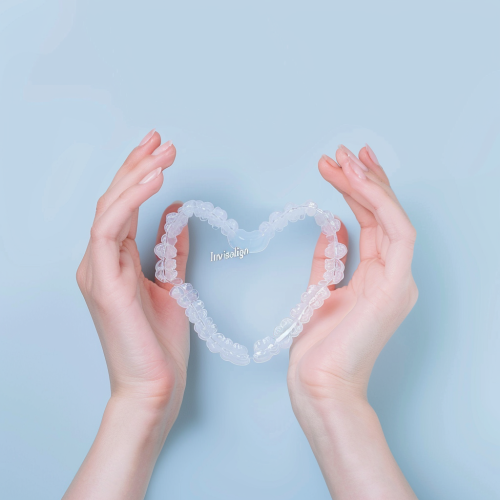The image features two hands forming the shape of a heart against a light blue background. The hands are holding a pair of clear dental aligners, which are positioned to create the outline of the heart shape, symbolizing care and affection for dental health. The aligners are transparent and slightly reflective, highlighting their sleek design. In the top left corner of the image, the word "Invisalign" is displayed, identifying the brand associated with these aligners. The overall composition is simple yet effective, conveying a message of love and satisfaction with orthodontic care through a visually appealing and symbolic representation. realistic photography --v 6.0