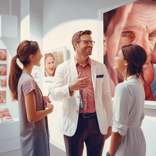 a realistic A dentist explains to the visitors of the exhibition on stage the types of new and modern smiles