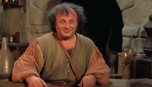 Burt Young, 40 years old, black hair, medieval beggar, background medieval tavern --ar 7:4 --style 39BKskT3PapdlpU