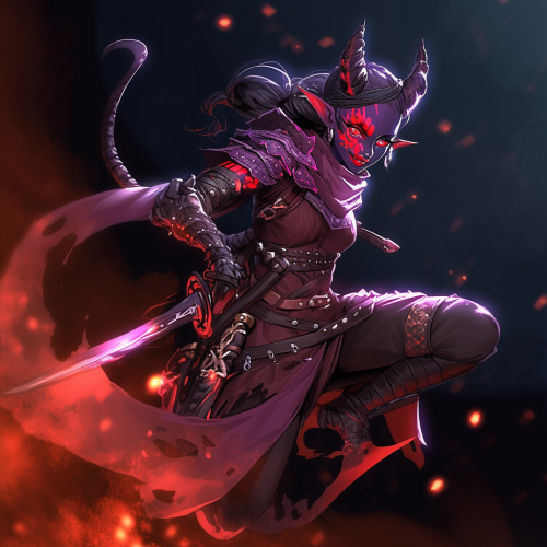 Grimdark aetherpunk amazing enhanced tiefling rogue champion, full body, anime style, upgraded rogue gear, magic dagger, high fantasy, digital art, masterpiece painting, ultra detailed, ultra high definition, 8K resolution, 3D shading, superior quality, cover illustration, complex design, luminous highlights, rich vibrant colours, hyperrealistic, meticulously hyper detailed, high contrast, artstation --niji 5