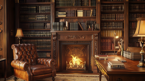 A refined English study room with space fragrance accents dark wooden bookshelves filled with leather-bound books, a vintage leather armchair near a polished mahogany desk, elegant fragrance diffusers and candles placed around the room, emitting soft trails of aromatic mist with scents of sandalwood, cedar, and lavender, antique lamps casting a warm, golden light, creating an atmosphere of calm and sophistication, subtle hints of vanilla and bergamot enhancing the ambiance, all captured in a classic, warm color palette with rich textures and high detail --ar 16:9 --q 2 --v 6.1