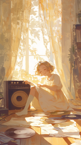 A young woman sitting by a vintage wooden radio in a cozy, sunlit room with soft, warm light pouring through the window. The room has a nostalgic, 1970s aesthetic with floral wallpaper, wooden furniture, and vinyl records scattered around. She gazes at the radio with a serene smile, feeling joy as her favorite song begins to play. The atmosphere is filled with a soft, golden glow, evoking a sense of peaceful nostalgia and happiness. water color style. Anamated. ar: 16:9