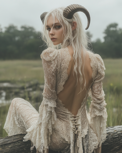 cinematic still, full body with legs shot from behind, of a young woman sitting on log, satan horns, skin, 28 years old, white hair, lace dress, open flowy, plussized --s 800 --ar 4:5 --v 6.1