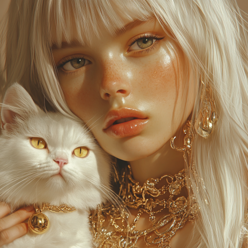 Create a stylized digital portrait of a young woman with long, straight platinum blonde hair, wearing oversized gold jewelry. Her expression is calm but stern, with a slightly exaggerated, doll-like face featuring full lips, high cheekbones, and light freckles. She holds a white cat that mirrors her expression with a slight scowl, its fur perfectly groomed and eyes sharp and attentive. The color palette is soft, with pastel pinks and whites, and the lighting is smooth, giving a dreamlike yet slightly edgy feel to the composition.