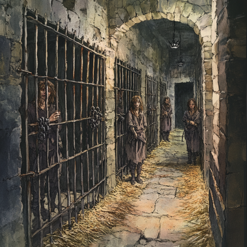 dnd illustration of This long room is partitioned into three areas, with iron bars walling off the north and south. Filthy straw lines the floors of those cells, the hinged doors of which are secured by chains and padlocks. A pair of disheveled human women are held in the cell to the south, while a human boy is confined to the north. All are dressed in plain gray tunics and have iron collars fitted around their necks.