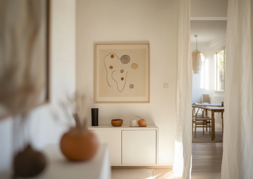 Entrance hall to the house, close-up of a narrow white dresser, on the wall above the dresser there is a white page with a drawing drawn by a child - in the drawing apples and honey are drawn. White living room with blurred background, daylight --ar 7:5