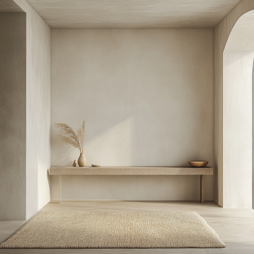 Design a minimalist entryway where 80% of the frame is a close-up of a smooth, white wall that is perfectly clean and textureless. The wall should be the central focus, well-lit with soft, warm lighting. At the far side of the frame, include a barely visible, blurred edge of a soft, woven rug in warm earth tones or a thin console table, suggesting a welcoming space without drawing attention away from the wall.