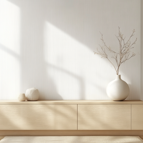 Plain white wallpaper with a smooth, untextured surface, creating a calm and minimalist atmosphere. Below the wall, a simple, modern cupboard with clean lines and a light wood finish, adding a touch of warmth to the relaxed setting. The composition is uncluttered and serene, with soft natural lighting that enhances the simplicity of the space, focusing on the white wall and the understated elegance of the cupboard beneath. –ar 128:95
