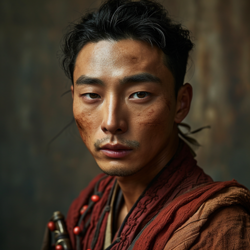 Create a detailed fantasy character portrait of Brother Quan, a blind monk, in a Baroque-inspired fine art style, with a serious and elegant tone. Brother Quan should wear his signature quilted suit beneath flowing monk robes and a wide-brimmed hat that casts a mysterious shadow over his face. His expression is serene, reflecting his deep connection to the lawful good deity, and his eyes, though unseeing, radiate wisdom. The illustration should capture the intricate texture of his quilted suit, adorned with subtle yet ornate patterns, and the graceful drape of his robes, which move fluidly as if caught in a gentle breeze. His staff, adorned with rings that shimmer faintly, should be shown resting at his side, hinting at its protective and healing properties. His posture is calm but powerful, suggesting a man who balances both physical and spiritual strength. In the background, incorporate understated Baroque-style flourishes, such as delicate, swirling vines and celestial motifs, that complement the character’s peaceful yet disciplined nature. Use muted but rich colors, with soft shades of earthy browns, deep blues, and hints of gold. The lighting should be subtle, with a soft glow that highlights his serene face and the elegant flow of his robes, while the overall composition exudes a sense of timeless grace, combining the hard lines of classical engravings with the organic curves of Art Nouveau.