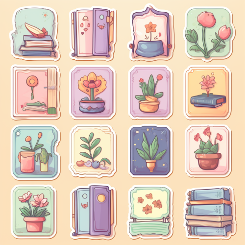 journal book icons sticker pack magic. Use a soft color scheme with pastel colors, The sticker should be painted in a loose, whimsical style.