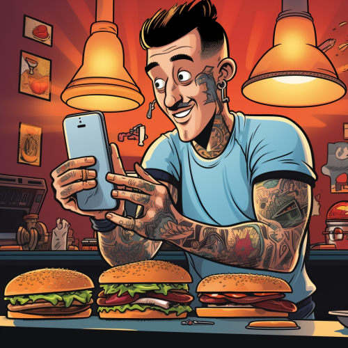 a cartoon boy with tattoos taking photos of burgers with an iPhone
