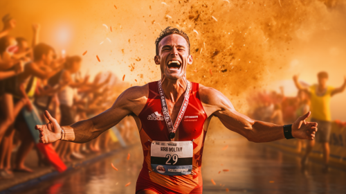 Generate a YouTube thumbnail similar to the one used by Average Rob for the video "The Day I Became an Ironman." The thumbnail should feature a dynamic and energetic scene that captures the spirit of completing a triathlon. Include elements such as finish line, but without a sports guy. The background should showcase the race environment, with cheering crowds, and a clear sense of motion. Use vibrant and motivating colors to enhance the excitement of the moment. Cinematic, hyperrealist, 32k, high resolution, light and shadow, --ar 16:9