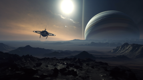 a barren planet covered with craters, saturn as the backdrop, small space ship flying by, --ar 16:9 --v 5