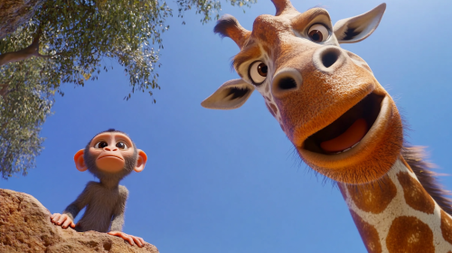 A wide shot of the African savannah with a tall, elegant giraffe named Zuma standing majestically among the grass and sparse trees. The background should have a bright, sunny sky and a few distant trees.utlra realistic,animated--ar 16:9
