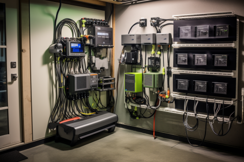 Unique charging station inside the garage of a house, battery system, result photo from the side --v 5.2 --style raw --ar 3:2