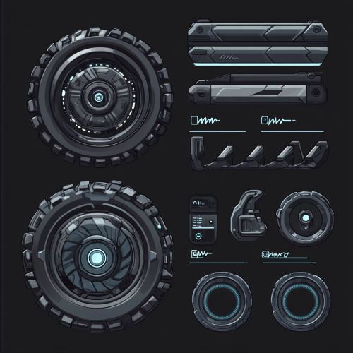 A panel showing parts of futuristic bike transformer including left tire, right tire, axle, front break, back break. Each part includes an icon of itself and a percentage progress bar under it, a button with word change on the right of the gauge. These parts are aligned.