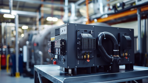 hyperrealisitc image of multiple high tech power supplies and ups systems in the Colors silver and gold, placed on a glass floor with a white futuristic background , wide angle--ar 16:8