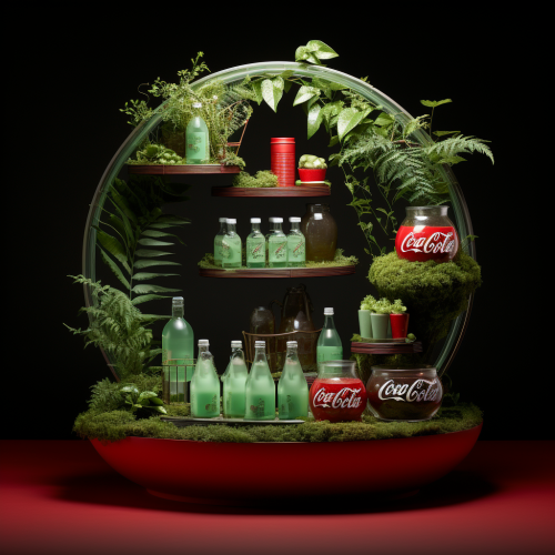 Coca Cola Zeta gadgets, a green and zen merchandising stand. super realistic photography --v 5.2