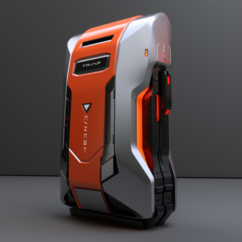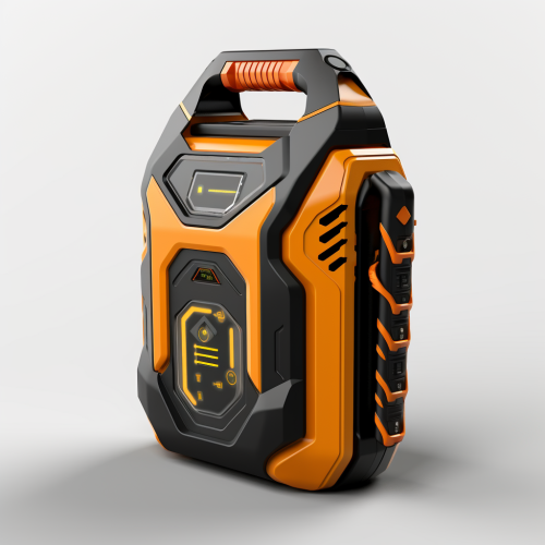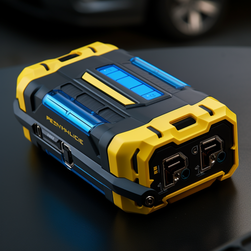Concept jump starter with two clamps mounted on side and power inverter socket, big LED screen, reality style, Michelin blue and Yello color, streamline shape, Simple design appearance