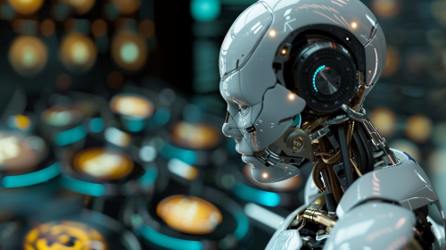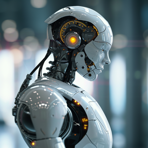 Biomechanic robot holding iphone. The picture showing implementation of AI into mobile phones. Use decent colours of lights (black, white, gold, silver, blue, gray) --ar 2:1
