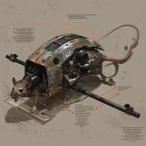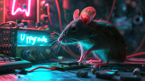 A cybernetic rat integrating a chip into a device, with a sign saying "Upgrade It" illuminated beside the chip slot. --ar 16:9 --v 6.0