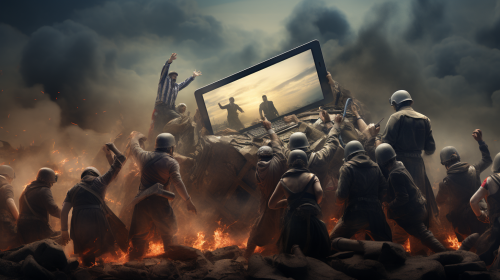 A dramatic scene reminiscent of the American Civil War, but with a twist: a giant smartphone dressed in a captain's uniform from the era, standing on a battlefield as if it's conquering the United States. The smartphone, personified with arms and a stern expression, holds a flag while troops of smaller gadgets rally around it. --ar 16:9 --q 0.5 --s 250