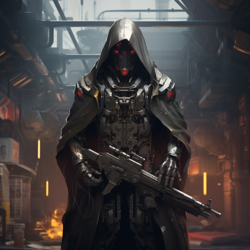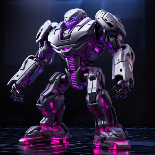 High tech robot, grey camo metal plates, reinforced, powerful, neon purple/pink highlights, standing --ar 1:1