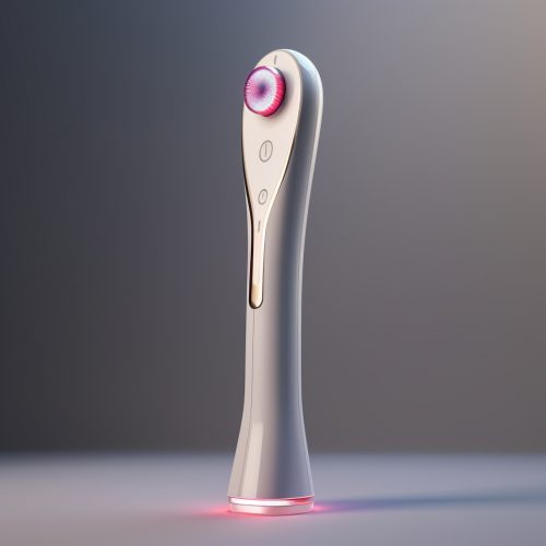 a modern and compact tabletop medical device designed for aesthetic treatments. The device has a sleek, white body with smooth, rounded edges and a minimalistic design. At the top, it features a high-resolution touchscreen interface that displays a colorful and intuitive user interface, showing various treatment parameters and real-time feedback. The device has two handheld applicators connected via flexible, white cables that extend from the front panel. The applicators are ergonomically designed for comfortable use, with the ability to control treatment settings directly from the interface. The overall design of the device is clean and professional, with a focus on functionality and ease of use in a clinical or aesthetic setting. The compact form factor ensures it fits easily on any countertop, making it ideal for use in modern dermatology or aesthetic clinics