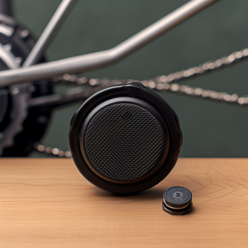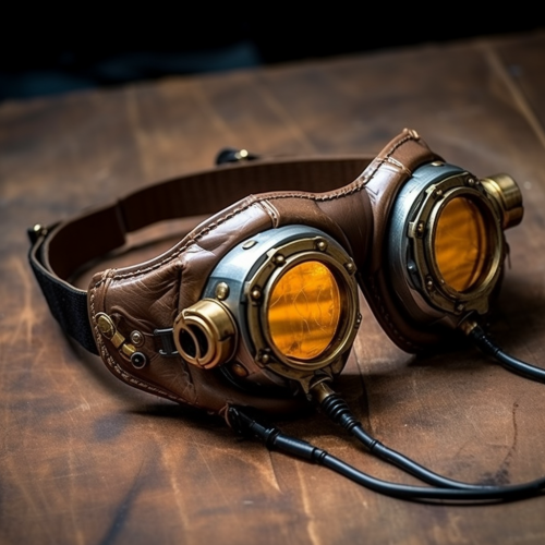 A photograph of a high-quality goggle-style camera device for one eye, designed to be worn over the ear. The device features an innovative, ergonomic design, with a focus on the sleek lens and sturdy earpiece. Set against a blurred background of a high-tech lab, emphasizing its advanced technology and usability in professional settings. The lab environment adds depth and context to the device's sophisticated design. Taken on: high-resolution camera, focusing on the camera device's unique goggle style, natural lighting --ar 1:1