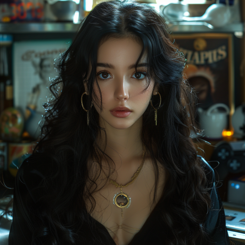 a beautiful greek goddess with long black hair and a magical aura, surrounded by consumer tech like iPhones, consoles, Apple products etc. - Photograph --v 6.0 --s 750
