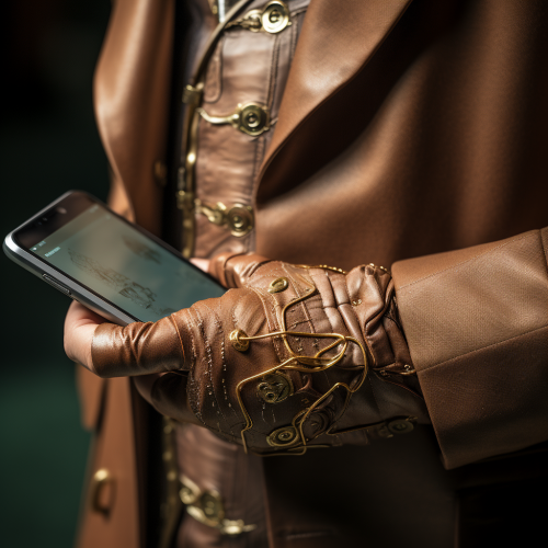 close up image of left hand with an implanted chip on metacarpus, in brown sleeve of coat holding a smartphone with a music player on the screen