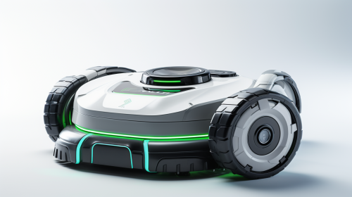 Industrial-grade robot vacuum, Blocky and powerful design, Gradual taper on the side, Smooth lines, Two sturdy rear wheels, Gray-green color scheme, Highly realistic, Studio lighting, White background, 8K --ar 16:9 --v 5.2
