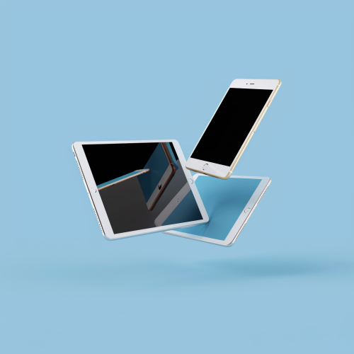 two ipads and two iphones floating in a solid blue background, 3D, realistic